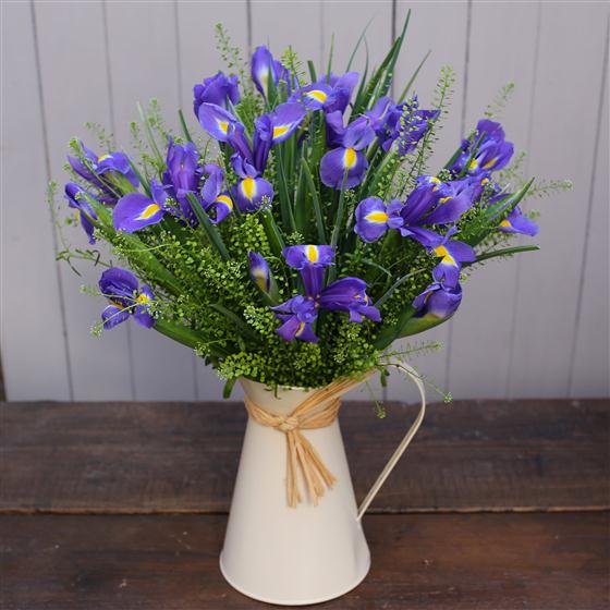 An enamel jug filled with beautiful Iris.