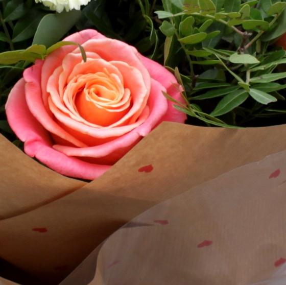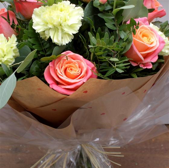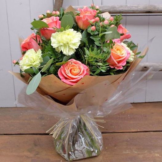 Half a dozen beautiful Miss Piggy roses, pastel green carnations, berries and seasonal foliage hand tied and presented in water.