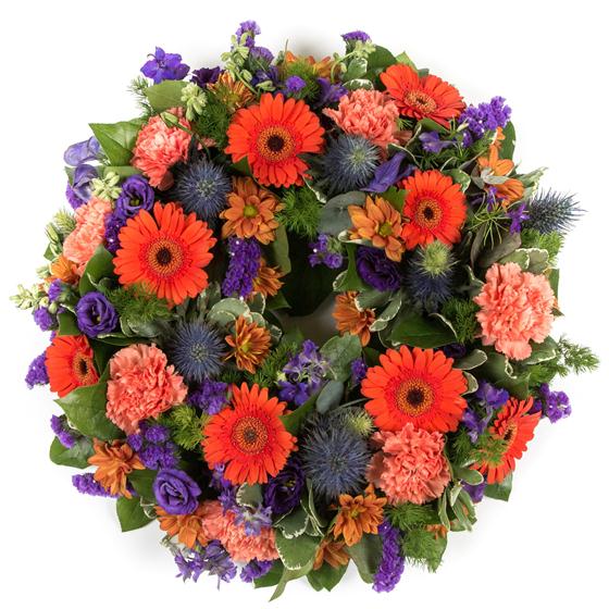 This traditional wreath combines thistles, statice, deep purple lisianthus, carnations and mini gerberas to create a masculine tribute.