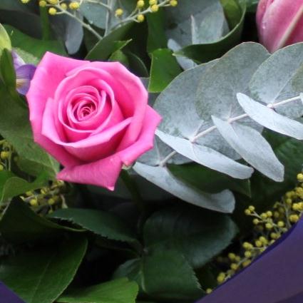 Large headed long stemmed pink roses, beautifully scented freesias and lilies mixed with spring foliage to make up this feminine hand tied bouquet.