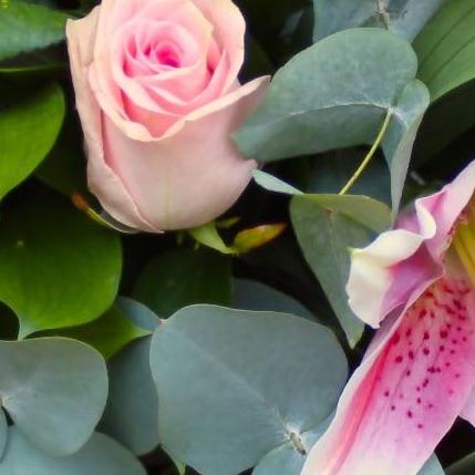 Oriental lilies and six pink roses are combined with eucalyptus and seasonal foliage to create this pretty, scented bouquet.