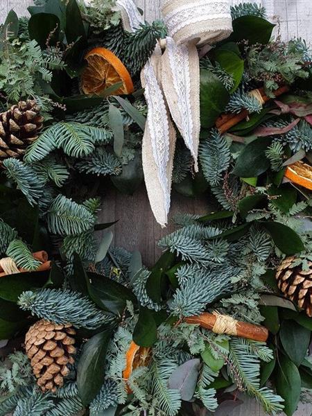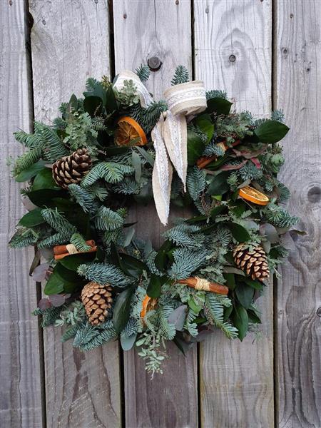 A fresh, festive scented wreath created using seasonal foliage, cones, dried orange slices and scented cinnamon.