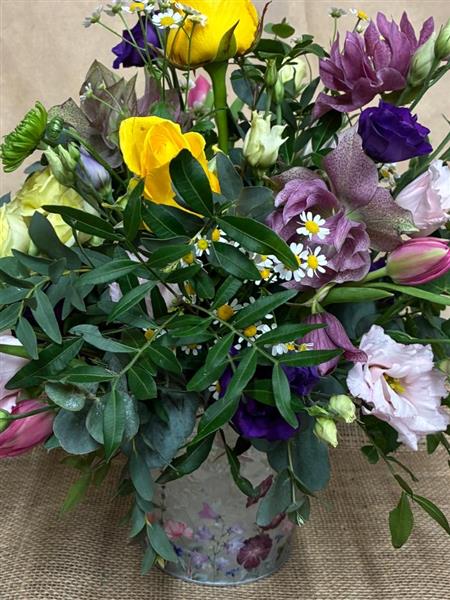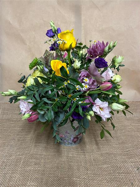 This delicate spring container is a feast for the eyes and senses, combining the classic spring colours and seasonal blooms, all brought together in a reusable galvanized metal pot for that perfect spring gift.