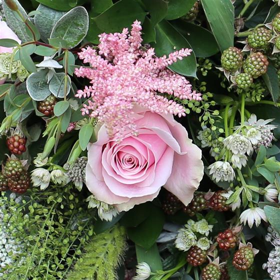 A hand tied of large headed pale pink roses and wild country flowers to suit.