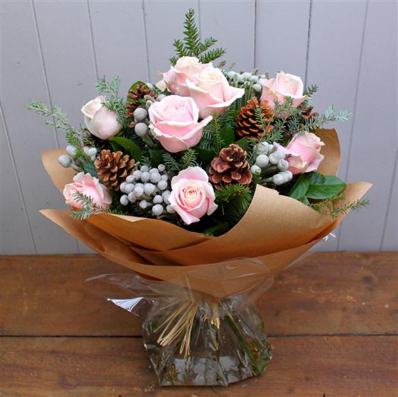 Vintage roses, Brunia, Sugar Pine and Pine Cones make up this winter hand tied.