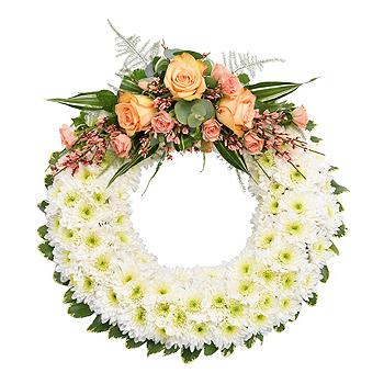 A classic white Chrysanthemum based wreath with a pink Rose and Genista spray.