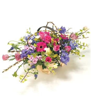 A country style Trug basket arrangement with a mix of flowers in delicate shades of pink, purple & blue, including Roses, Aconitum, Veronica and Phlox. Size: Height - 28cm (11") Length - 40cm (16").