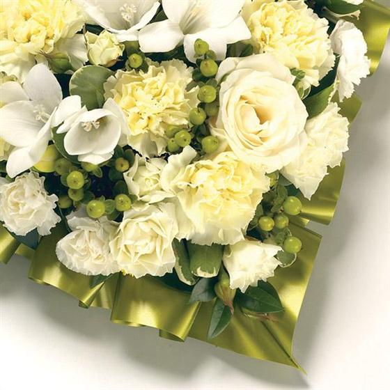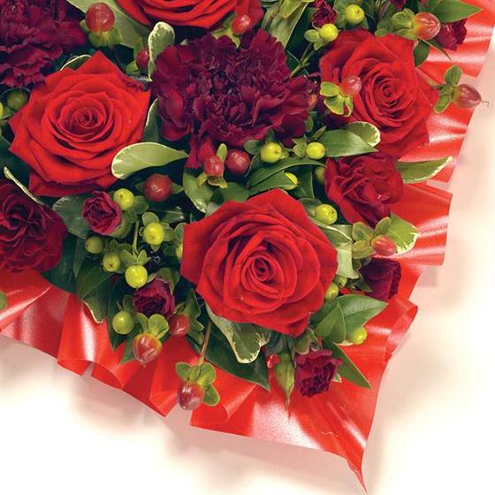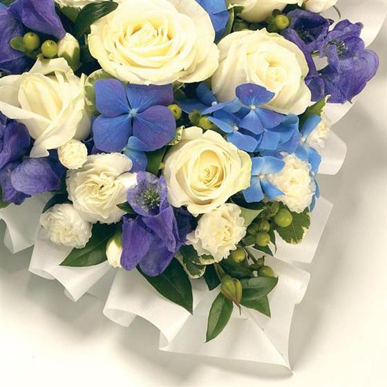 A beautiful pink & white coloured heart shaped tribute, featuring Roses, Eustoma, Chrysanthemums, fragranced Freesias and complementary foliage with a ribbon edge. Size: Height - 33cm (13") Length - 33cm (13").
