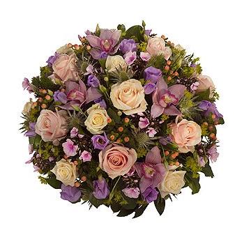 A very pretty pastel posy pad. Pink and cream Roses, pink Cymbidium Orchids, Hypericum and Phlox with purple Lisianthus and a generous mix of foliage.