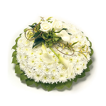 A white Chrysanthemum based posy with foliage edge, decorated with a classic spray of white Roses, Calla Lilies and complementary foliage. Size: 31cm (12").