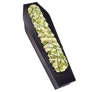 An elegant casket spray floral bar of white Roses, Hydrangea and green Viburnum with a flourish of Lily Grass.