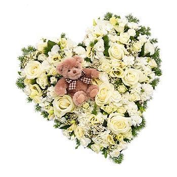 A classic white Rose and Hydrangea heart with Carnations and cream Lisianthus.