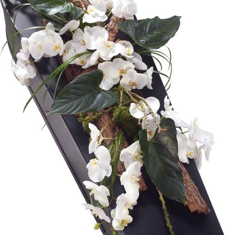 A white Phalaenopsis Orchid casket spray beautifully complemented with Anthurium leaves.