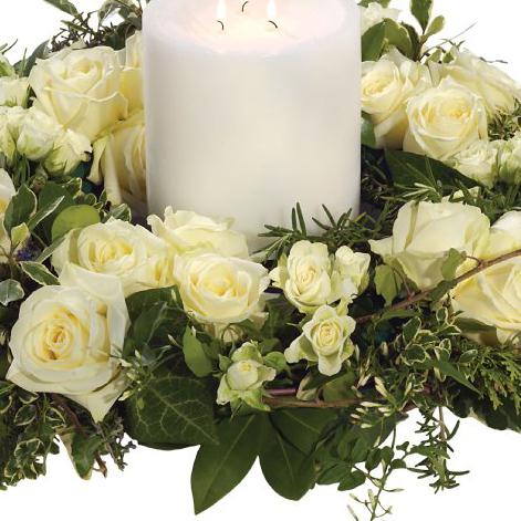 A three wick church candle encompassed by a white Rose and Jasmine wreath with foliage.