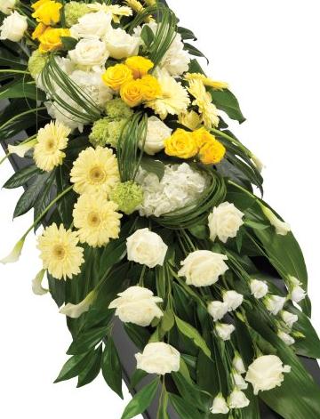 A lovely white and yellow casket spray featuring Roses, Hydrangea, Calla Lily, Gerbera, Lisianthus and Carnations complemented an assortment of luscious green foliage.